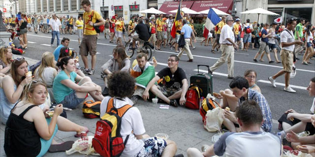 El Paseo de Recoletos, Gran Vía y las calles adyacentes se convirtieron en una gran torre de Babel donde los peregrinos de todos el mundo venidos a Madrid mostraban orgullosos sus banderas. Al cruzarse con grupos de otros países se saludaban y animaban.